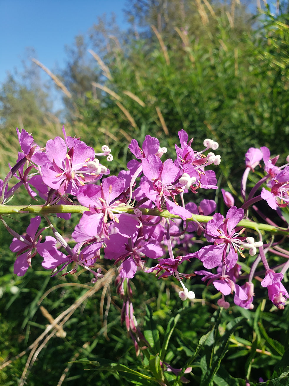 Blackened soil, standing dead trunks, the smell of smoke baked into the hillside. I had walked this stretch of trail the year before when the fire moved through. Now the ground was covered in color. Fireweed rose above the ash in tall stalks, pink flowers catching the sun, leaves clean and green against the char.